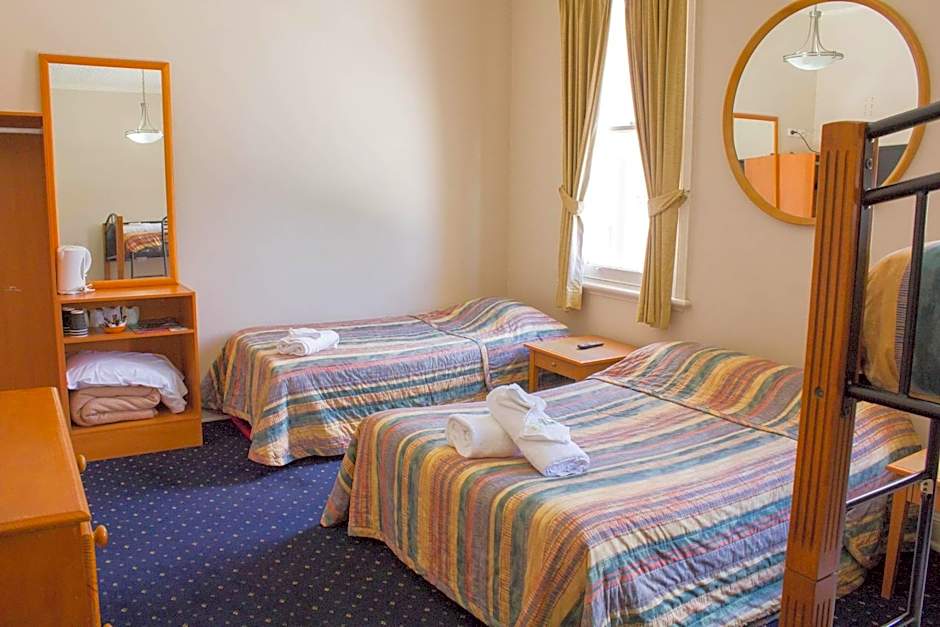 The types of rooms available at Gardners Inn Hotel include Twin Rooms with Private or Shared Bathrooms, Double Rooms with Private or Shared Bathrooms, Single Rooms with Shared Bathrooms, and Family Rooms with Private Bathrooms. All rooms are non-smoking. The Twin Rooms accommodate up to 3 adults and 2 children, while the Double Rooms and Single Rooms accommodate up to 2 adults and 1 child. The Family Room can accommodate up to 5 adults and 4 children. The beds in the rooms vary between Twin, Double, and Bunk beds.