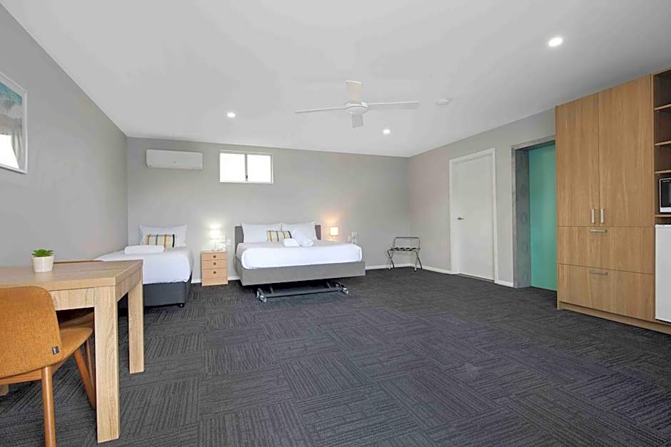 Located on the first floor, with 1 Queen bed & 1 King Single bed. This air-conditioned room features an private bathroom that has a balcony with views over our pool and the nearby golf course. It also has a flat-screen TV and a kitchen with a microwave, dishwasher, oven and a refrigerator. Maximum occupancy is 3 (see Hotel Policies). *Note this room type is not pet friendly, please contact Hive Reception directly for assistance with your pet.