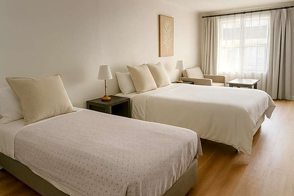 Room options span several styles, from Standard Rooms to Deluxe and family-friendly configurations. Examples include Standard Room (258 sqft) with a Queen bed for 2 adults and 1 child; Deluxe (323 sqft) with a Twin and a Double bed for up to 3 adults and 1 child; Deluxe, 2 Twin (323 sqft) with two Twin beds for 2 adults and 1 child; Classic Family (431 sqft) with two Twin beds and a Double for 2 adults and 1 child; Classic Family Room (431 sqft) for up to 4 adults with two Twins and a Double; plus Sea View Double Room and Apartment options. All accommodations are non-smoking.