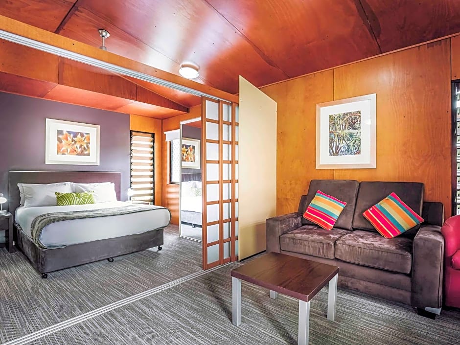 The Mercure Darwin Airport Resort offers a variety of room types including Superior Queen Rooms, Deluxe Queen Rooms, Deluxe Queen Bungalows, Superior Rooms with One Queen and One Single Bed, Bungalows with Queen Bed, Family Rooms with One King Bed and Two Single Beds, Superior Spa Rooms with Queen bed and Sofa Bed, Pool Villas, and Deluxe King Suites. Smoking is not allowed in any of the rooms. The rooms accommodate between 2 to 4 adults, with some rooms also accommodating children. Bed sizes range from Queen to King size beds.