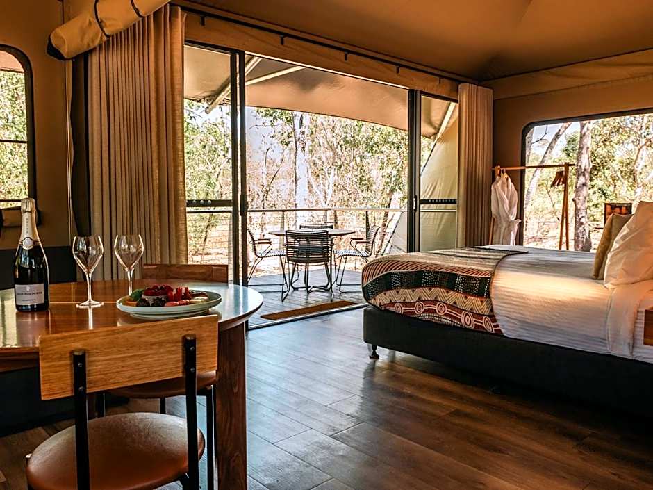 At Cooinda Lodge Kakadu, the hotel offers various types of rooms including Tents, Outback Retreats (Glamping), Lodge Family Rooms, and Lodge Twin Rooms. These rooms range in size from 237 sqft to 269 sqft and do not allow smoking. The occupancy for these rooms varies, accommodating between 2 to 4 adults and 0 to 3 children. The bed sizes include King, Queen, Twin, and Bunk beds.