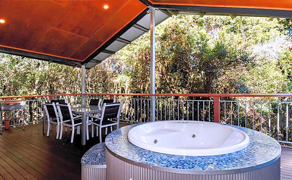 This fully self-contained, modern villa features expansive private decks with an outdoor spa bath and barbecue facilities. It also includes a fully equipped kitchen, flat-screen TV and air-conditioning. Each bedroom has a private private bathroom.