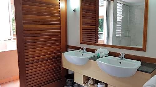 This studio features a king-sized bed or 2 single beds. There is a wardrobe, separate toilet and separate bathroom with spa bath. There are pool & garden views from the small private balcony.