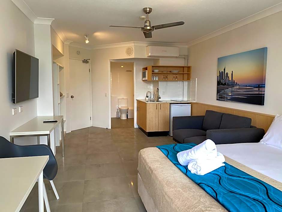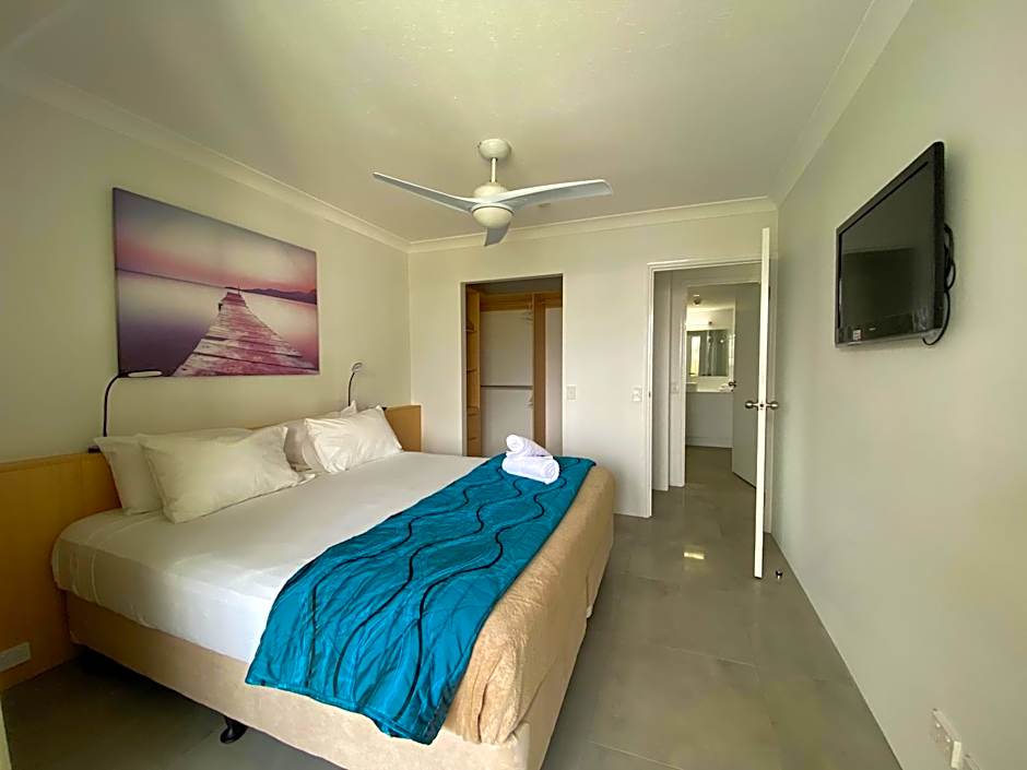 Our comfortable two bedroom river apartments are fully self-contained and feature a full kitchen, one bathroom, two bedrooms, laundry and one living room area, one TV and wireless internet access. Ideal for families and larger groups these Surfers Paradise family accommodations feature one queen bed and two single beds and are suitable for a maximum of 5 people