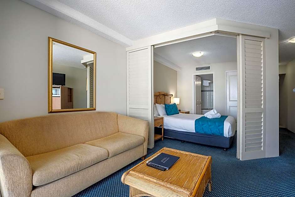 Studio Beach Superior Suites offer a queen size bed, lounge area, kitchenette with 2 plate cooktop, microwave oven and bar style fridge, private bathroom with combination washer/dryer and either a step-up spa bath OR a walk-in shower.