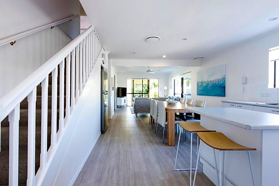 This riverfront townhouse has 4 bedrooms (including one downstairs) and 3 bathrooms. There is a large kitchen, 2 living areas, and an undercover patio with BBQ facilities, overlooking the Noosa River.