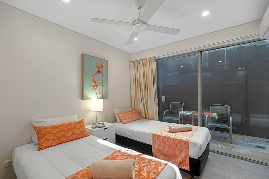 Gardenview apartment is set on lower level with direct elevator access to apartment entry. Is is suitable for families and people with mobility concerns. The apartment is open plan format with all modern conveniences and very spacious rooms. Being located towards the front of the resort it provides for easy access to pool, reception and parking lots. With a fully equipped kitchen, laundry and 2 bedrooms and 2 bathrooms it is very comfortable for short or long stays. The master bedroom contains a king-size bed, private bathroom and generous wardrobe the 2nd bedroom feature 2x single beds and built in robes, main bedroom offers walk in shower and bath. The apartments enjoy a large balcony looking over the garden. 2nd Bedroom is locked off for this room type.