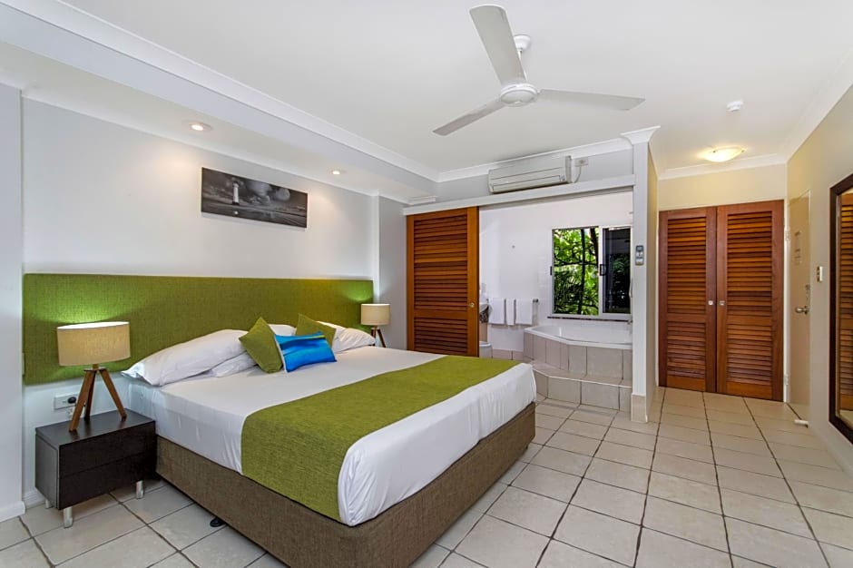 This fully air-conditioned suite is located in a tropical rainforest setting. It features a king-sized bed with a corner spa bath. There is a kitchenette with a stove top and a microwave as well as a private balcony that has a dining area and overlooks the pool or tropical gardens. The lounge has a flat-screen TV, DVD player, free cable channels, USB charge points, free WiFi and ceiling fans. The Superior Spa Suites are located on the ground or 1st floor. Access to all rooms is via stairs.