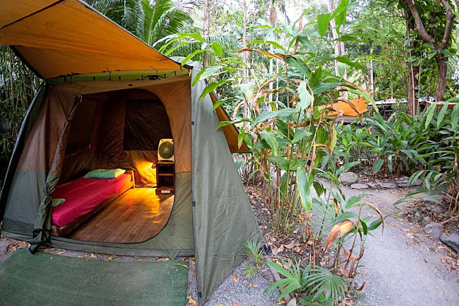 Lodging options span dorm-style and private spaces, including an 8-bed dorm, a 4-bed bunk dorm, a tent with a twin, a tropical bungalow with a twin, plus economy and double room configurations and a bungalow. Payments are flexible, with cash, Mastercard, Visa, and Bankcard accepted.