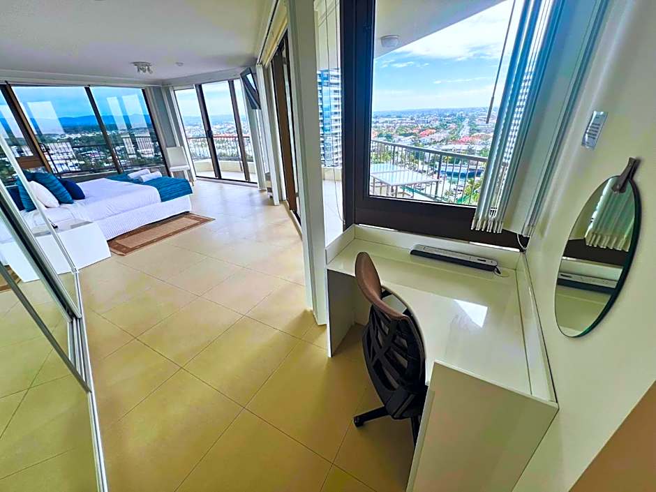 This refurbished 3 bedroom apartment has a spacious living area and balcony views across the Broadwater and down to Coolangatta in the South, as well as the Hinterland in the West. It has an ensuite, plus two showers and a separate fully equipped laundry. One shower is over a corner tub (not a spa bath). It also offers 3 TVs with satellite channels, free WiFi and an office nook in the master bedroom.