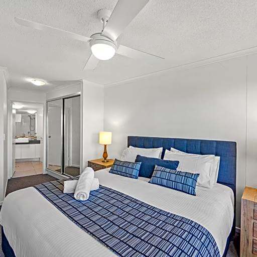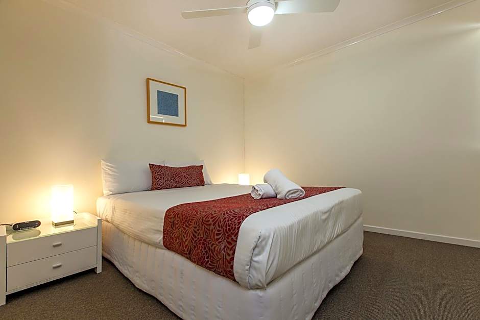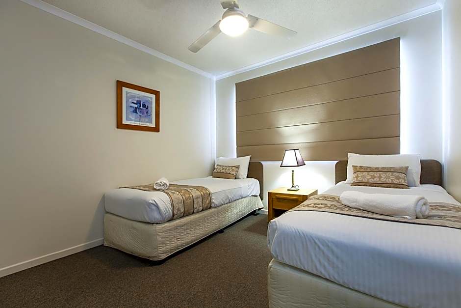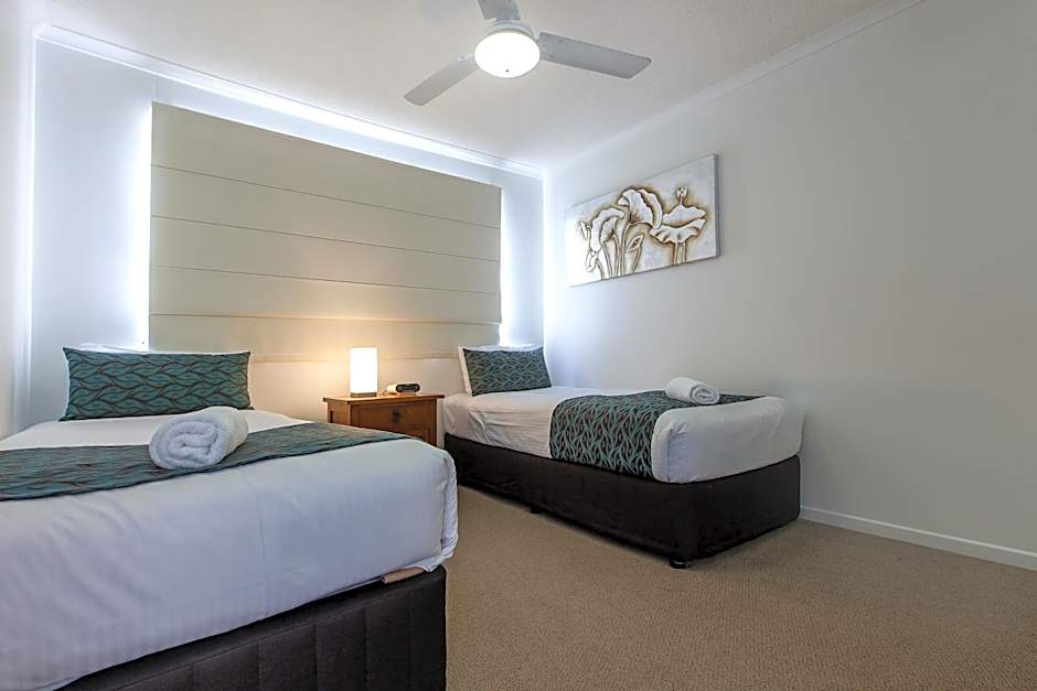 The Mirage Resort Alexandra Headland offers a variety of room types including studio rooms, 1-bedroom apartments, and 2-bedroom apartments. Occupancy varies by room type, with studios accommodating up to 2 guests, 1-bedroom apartments accommodating up to 3 guests, and 2-bedroom apartments accommodating up to 5 guests. All rooms are non-smoking and feature a range of bed sizes including queen and single beds.