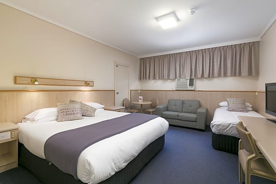The rooms available at Comfort Inn Glenelg include Deluxe 1 King Bed, Twin Room, Family Room, and King Room. Most rooms do not allow smoking. Occupancy ranges from 2 adults, 1 child to 4 adults, 3 children. Bed sizes vary from Twin beds to Queen and King size beds, with room sizes typically around 215 sqft to 280 sqft.