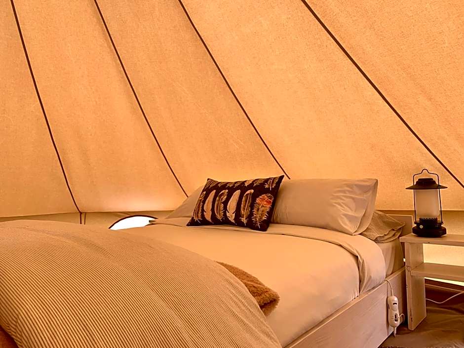 Accommodation options span a mix of outdoor-ready tents, cozy bungalows, and convenient studios. A Tent is 129 square feet and sleeps 2 with a Queen bed. Room - 2 Twin is 161 square feet and includes two Twin beds plus a Queen, accommodating up to four. For larger groups, Bungalow options include Double (one Double bed plus a bunk) and Double, 2 Bedroom (one Double bed plus three bunks), catering to families and friends. A Studio rounds out the lineup, accommodating 2 adults and 1 child.