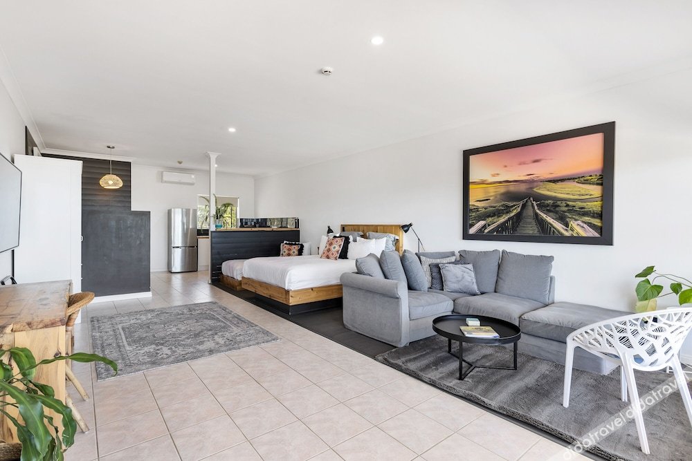 This ground floor suite features and a deck to enjoy a morning coffee. The spacious open plan living area includes split-system heating and cooling, a kitchenette with a stove top, microwave, refrigerator and tea and coffee making facilities. It also has a dining area, flat-screen satellite TV and a bathroom with free toiletries. Bedding is 1 queen bed and 1 single bed, both with deluxe pillow-top mattresses. Please note that the price is based on 2 guests sharing a queen bed . Twin share is an additional AUD 15 per night. Maximum occupancy is 3 (see Hotel Policies).