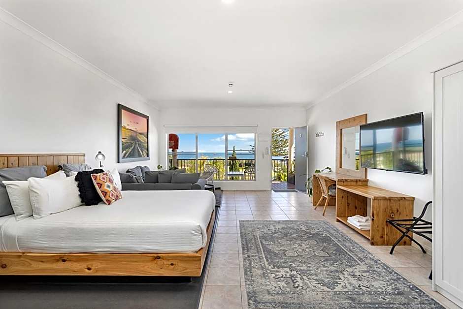 This upper floor suite features spectacular ocean views and big windows to watch the sunsets over the ocean. The spacious light filled open-plan living area includes split-system heating and cooling, kitchenette with a sink, stove top, microwave, refrigerator and tea and coffee making facilities. It also has a dining area, flat screen TV and a bathroom with toiletries. Bedding includes 1 queen bed and 2 single beds. with deluxe pillow-top mattresses. Please note that the standard price is based on 2 guests sharing a Queen bed. Twin share is an additional AUD 10 per night. Maximum occupancy is 4 (see Hotel Policies).