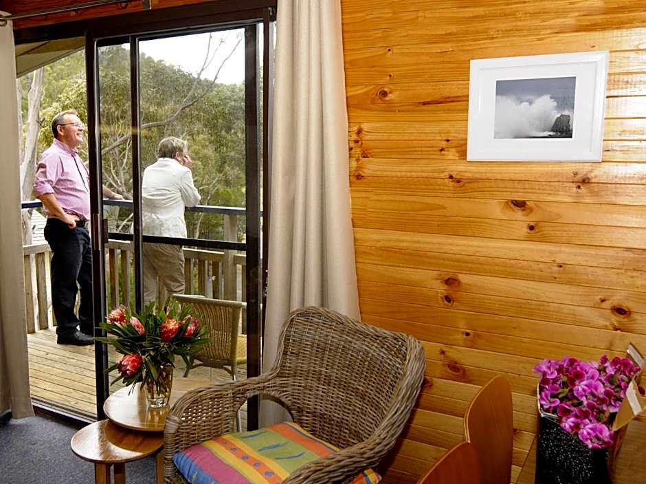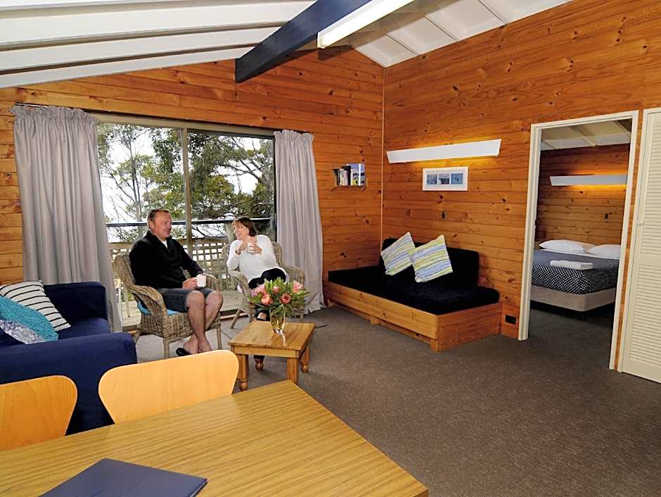 These 2-bedroom bungalows overlook the bush. It includes a queen-sized bed and 2 single-sized beds as well as a fully equipped kitchen, bathroom, lounge/dining room, private veranda and covered parking at your door. The Two Bedroom Bungalow is perfect for a family. Please note that this bungalow is on two levels and has stairs leading up to the bedrooms. All the living and bathroom area is on the ground floor.