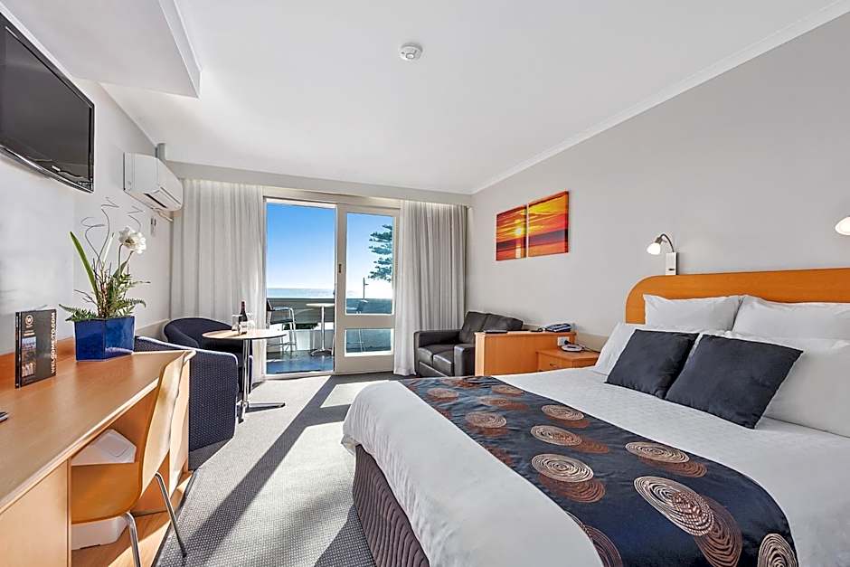 At Beachfront Voyager Motor Inn, one of the room types available is the Executive Suite with Sea View and Balcony. This suite offers a spacious room size of 280 sqft, a queen size bed, and a balcony with a sea view. Smoking is not allowed in this room. It can accommodate two adults and one child.