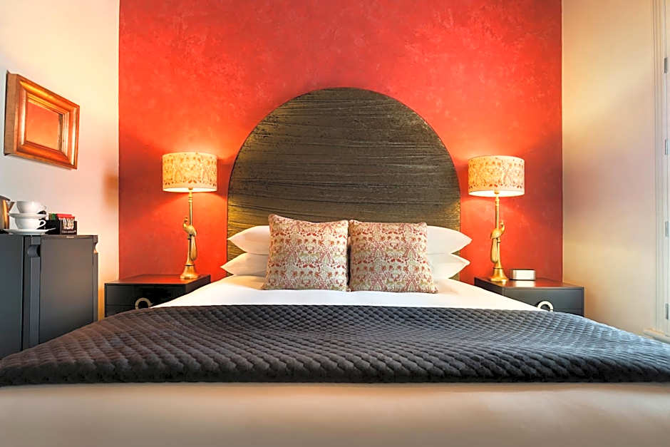 Sapphire is an opulent, contemporary suite featuring wall to wall velvet upholstery in jewel tones, a king bed and local artworks are beautifully complimented by the Moroccan bedside pendants. The luxurious private bathroom features a free-standing spa bath, large walk in shower. Enjoy all the amenities, such as large flat-screen TV and mini bar. This suite is located at the rear of the hotel and accessed from a private entrance. Please note that there is no capacity for additional guests, or external facing windows. there is a small amount of natural light, through small high windows.