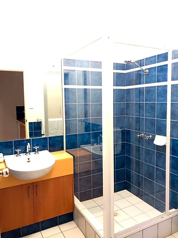 This room a king bed, a partitioned wall and asingle bed There is a sofa, private bathroom, reverse cycle air conditioning, TV, bar fridge, microwave, toaster, kettle and free on-site parking. Please note this room is located on the first floor accessed by stairs.
