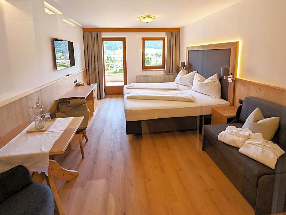 The Hotel Alpenpanorama offers Standard Double Rooms and Suites with Mountain View. The Standard Double Rooms have a room size of 248 sqft and accommodate 2 adults with a queen-size bed. These rooms do not allow smoking. The Suites with Mountain View have a larger room size of 463 sqft and also accommodate 2 adults with a queen-size bed and a sofa bed. These suites are also non-smoking.