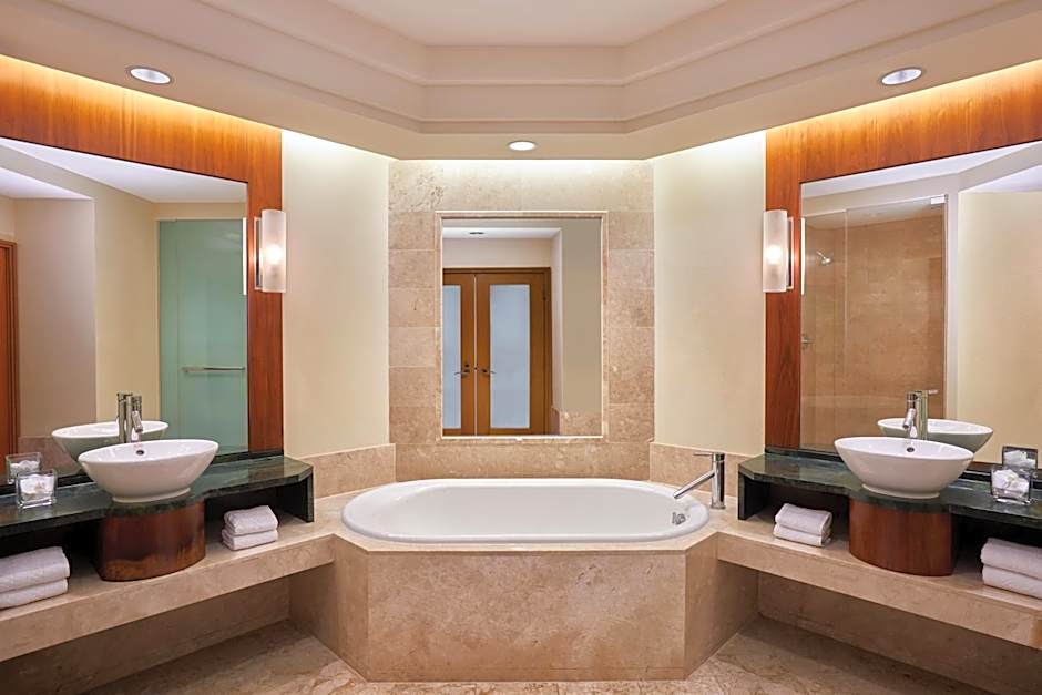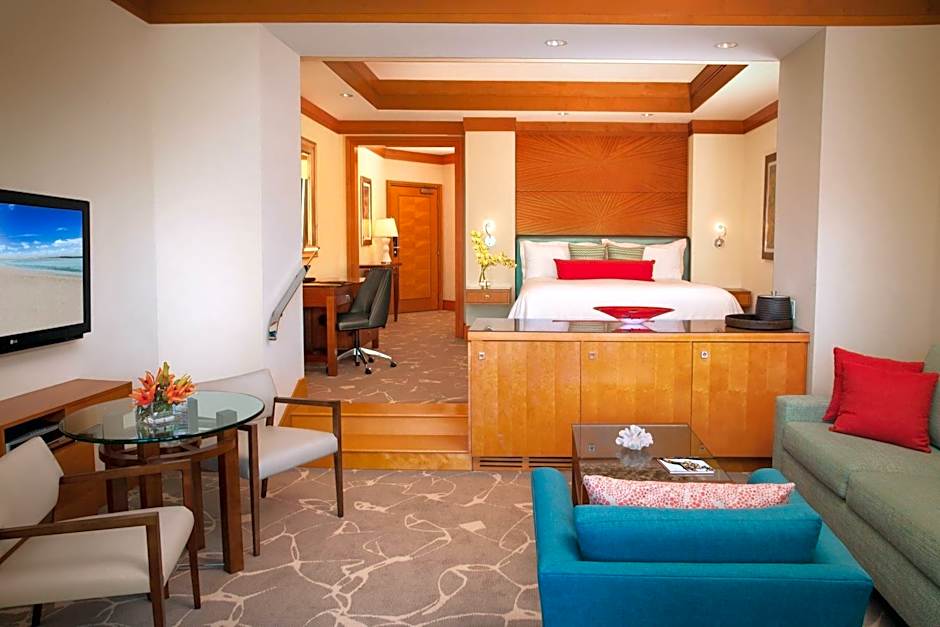 Located on the top five floors, this 1-bedroom club-level suite boasts 1,198 square feet of living space and breathtaking views of the ocean and the Atlantis waterscape. Has an open floor plan with ample living space, floor-to-ceiling window, and two fully furnished balconies. The bedroom features a King Bed. The living area offers a queen sleeper sofa for added comfort. The oversized bathroom includes a deep soaking tub and separate shower with rainfall showerhead. • Butler Service • Exclusive Access to Lapis Club for guests 12 and older • Butler Service • In-Room Dining • Nightly Turndown Service • Premium Wi-Fi • Minifridge • Robes • Flat-screen HDTV • Keurig K-Cup Coffeemaker • Individually Controlled A/C • Bath Amenities • Iron and Full-Size Ironing Board • Clothes Steamer • Hairdryer • Bathroom Scale • Laptop-size in-room Safe • Size: 1,198 sq. ft. • Views: Ocean • Max Occupancy: 3 Guests and 1 Child under 4 (Only children 12 and older will have access to Lapis at The Cove)