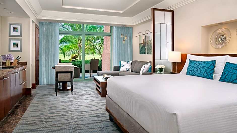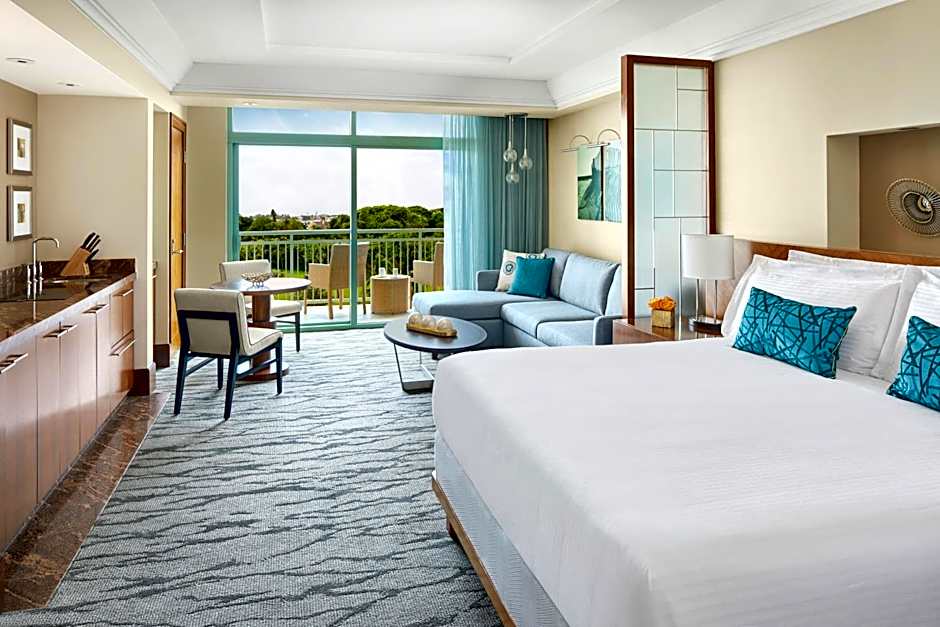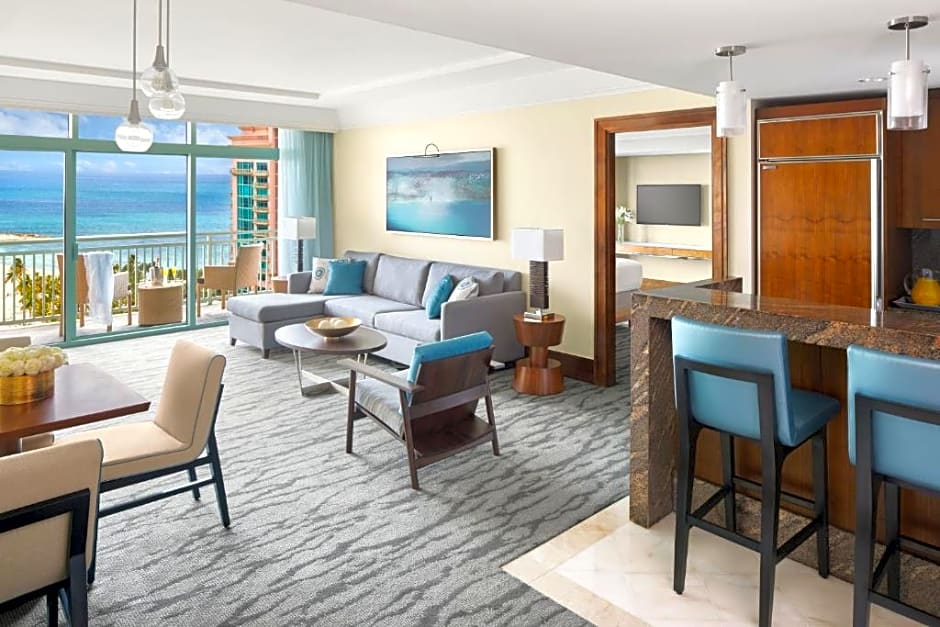 Located on floors 1-4 and just steps away from the white-sand beach and crystal-clear Caribbean, this spacious Studio offers a 1 King Bed and a Queen Sleeper Sofa. Enjoy a fully equipped Kitchenette, a table with 2 chairs, a large master bath with twin basins, and deluxe amenities. Relax on your private balcony or terrace overlooking the tropical Atlantis landscape. • Kitchenette • Mini-fridge • 2 Burner Cooktop • Toaster and Blender • Coffeemaker • Dishwasher • Cookware • Flat-ware and Glassware • Flat Screen HDTV • Individually Controlled A/C • Bath Amenities • Iron and Full-Size Ironing Board • Hairdryer • Bathroom Scale • Alarm Clock • Laptop-size in-room Safe • Premium Wi-Fi • In-Room Dining • Size: 523 sq. ft. • Views: Resort/Garden • Max Occupancy: 3 Guests and 1 Child under 4
