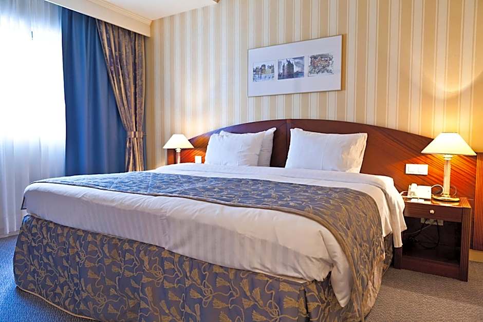 A diverse room lineup includes options such as Executive, Deluxe, Junior Suite, Ambassador Suite, Elegant Suite, and more, with some layouts offering terraces or panoramic city views. Accepted payment methods include cash and major cards: Visa, American Express, Mastercard, Diners Club, Maestro, and Bancontact.