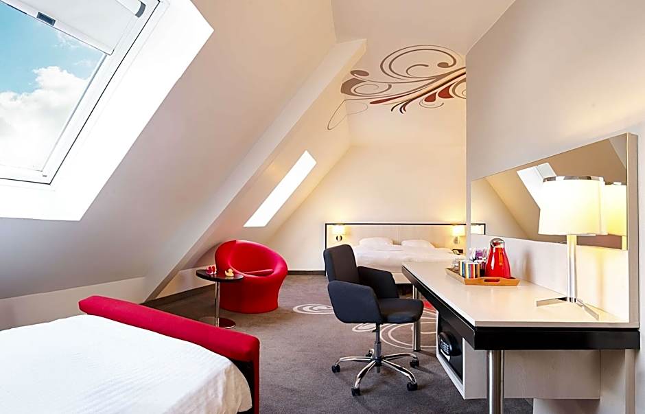 The superior rooms are available with a king size bed or two twin beds. These spacious corner rooms feature large windows with city view, a working area with a desk, a bathroom with bathtub, toiletries as well as bathrobes and slippers. Free bottled water is provided. Please note that an extra bed can be placed in this room for a surcharge of 35 EUR per night.