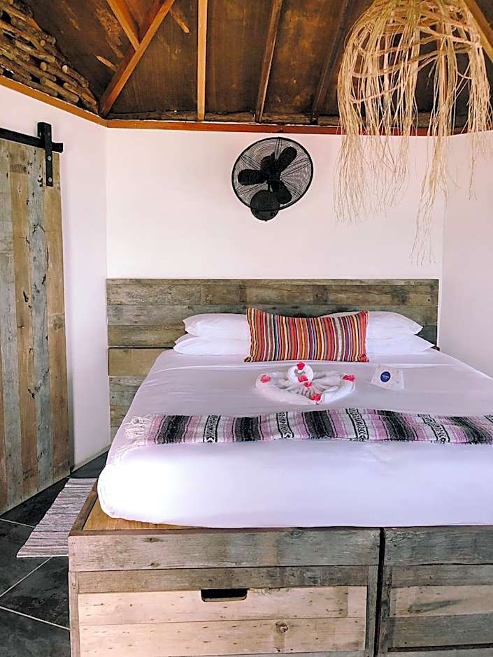 This incredible bungalow features an overhang balcony that offers incredible 180-degree views of the Caribbean Sea. It has a hammock area, tiled floors, fans and a bathroom with hot water.