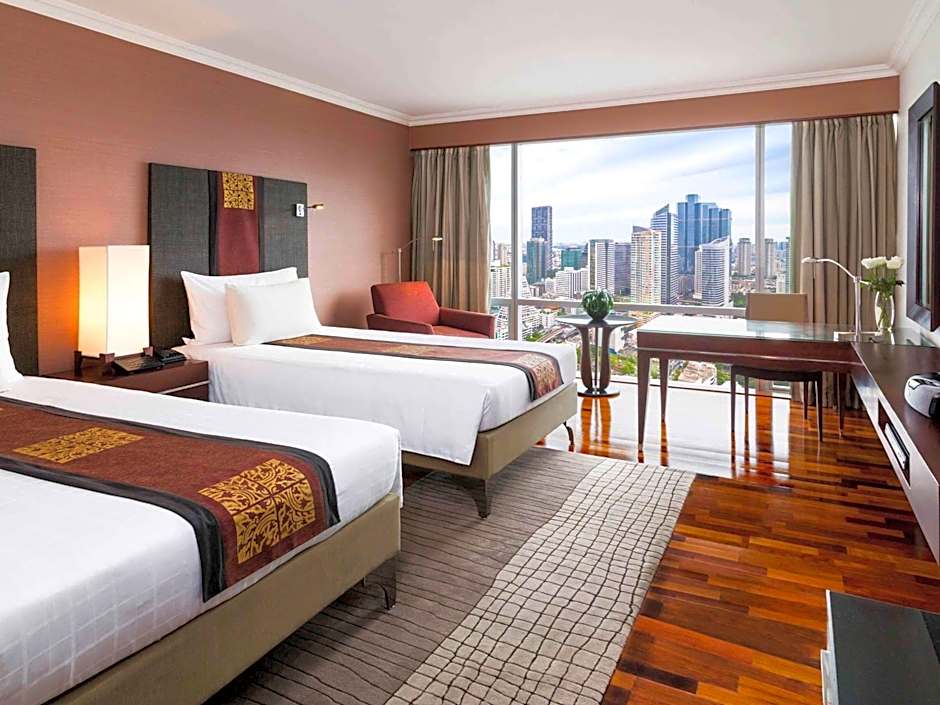 Room choices cover a range of needs, from a Twin Room with a single twin bed for two adults to an Executive Balcony (194 sq ft) with a double bed plus two twins for two adults and one child. The Suite Master with Panoramic View spans about 398 sq ft and includes a queen bed plus a sofa bed, while a Superior room (183 sq ft) accommodates up to four adults and three children with a double bed and two twins. Other options include Quadruple Rooms (including panoramic views) and rooms with balconies, providing various layouts for different group sizes.