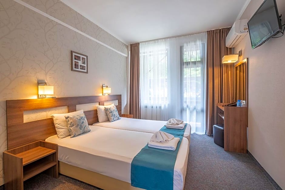 The Park Hotel Asenevtsi offers various types of rooms including Twin Rooms with and without balconies and One-Bedroom Suites. The Twin Rooms accommodate 2 adults and come with either a balcony or a free Relax Zone. The One-Bedroom Suites accommodate either 3 adults or 2 adults and 2 children, and also offer a free Relax Zone. All rooms are non-smoking and the bed sizes vary between Twin beds, sofa beds, and futon mats.