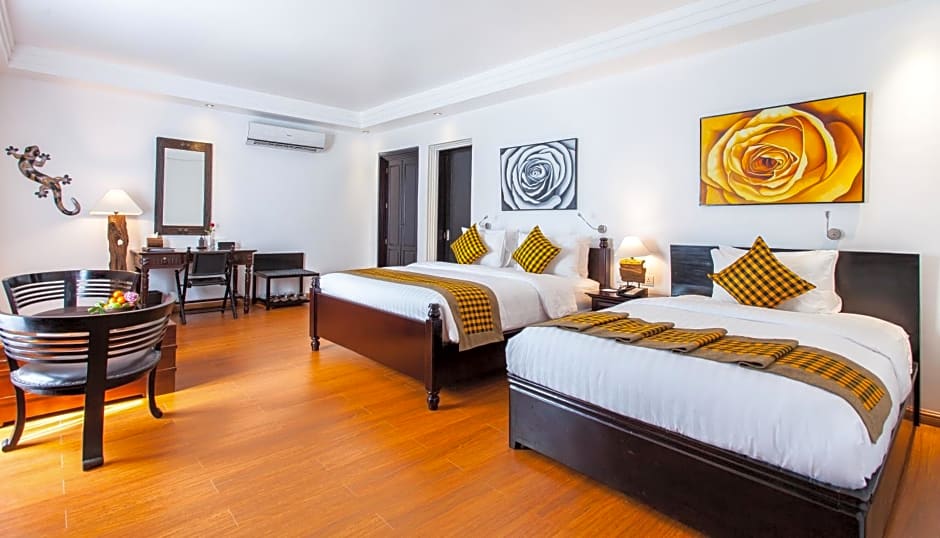 Offering garden views, this air-conditioned twin suite has a flat-screen cable TV, DVD player and an electric kettle. The complimentary mini-bar is replenished daily. Benefits include: - Welcome fruit platter in the room - Complimentary welcome nonalcoholic cocktail upon arrival - One-time 60-minute Khmer massage per guest