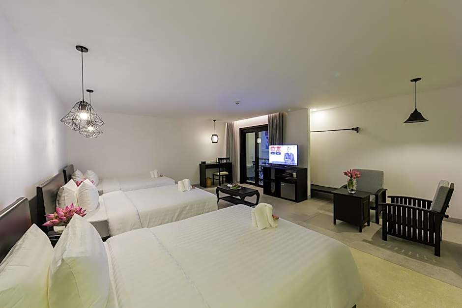 A diverse lineup of rooms caters to different groups, including Landmark (2 Double) at 388 sqft with a capacity for up to 4 adults and 1 child; Family Land View at 862 sqft; Deluxe Triple at 527 sqft; King Room; and a Suite. Each room comes with air conditioning, private entrances, soundproofing, balconies, bathtubs, and garden or landmark views, while non-smoking policies are standard. The property accepts Cash, Visa, and Mastercard.