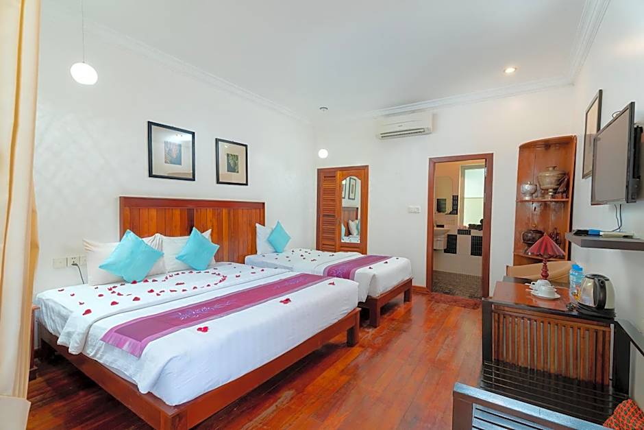 At Asanak D'Angkor Boutique Hotel, guests can choose from rooms like Deluxe Triple Room for 3 adults with 1 King size and 1 Twin bed, Deluxe Double Room for 2 adults and 1 child with a King size bed and 2 Twin beds, as well as Twin Room with Pool View for 2 adults with 2 Twin beds. Smoking is not allowed in any of these rooms. The room sizes range from 301 sqft to 323 sqft.