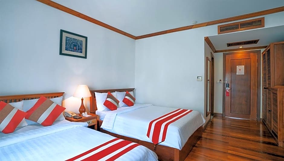 Cheathata CTA Hotel Siem Reap offers a variety of room types including Deluxe Triple, Large Double, Family, Large Twin, Deluxe Double, and Deluxe Twin rooms. Occupancy ranges from 2 adults in the Large Double and Large Twin rooms to 4 adults and 1 child in the Family room. All rooms are non-smoking and feature different bed sizes such as Twin, Queen, and King.