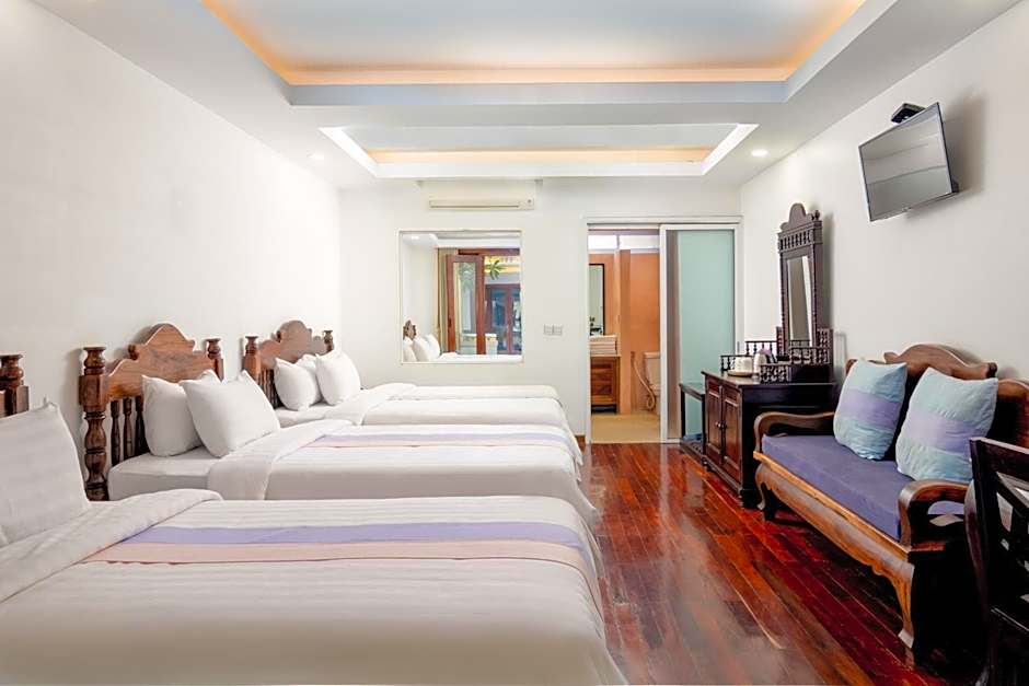 La Residence Watbo Hotel offers Deluxe Triple, Twin, Double, and Family rooms, some with pool views. Smoking is not allowed in any of the rooms. The occupancy of the rooms ranges from 2 adults with 1 child to 4 adults with 1 child, with bed sizes including Twin, Queen, and King. The room sizes vary from 484 sqft to 969 sqft, providing ample space for guests to enjoy their stay comfortably.