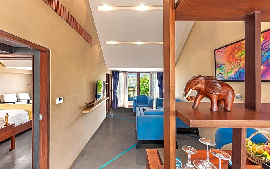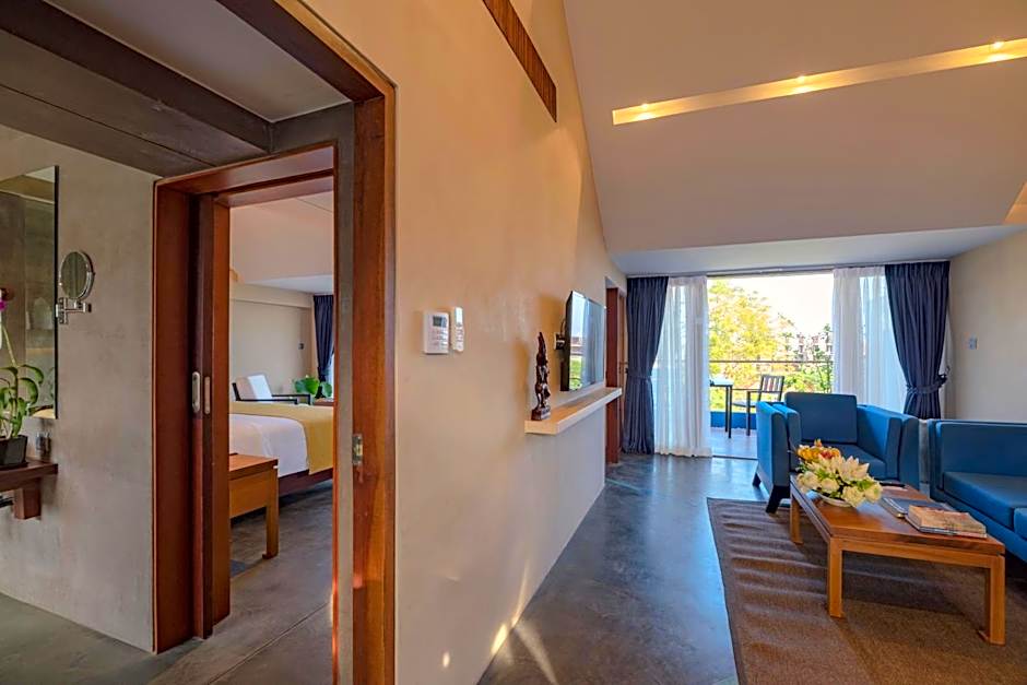 This tastefully appointed, contemporary-styled room is located on the third floor of the hotel that overlooks views of the pool or the city. It features private courtyard access, stucco walls, and a separate lounge area with an attic-styled roof. The bathroom comes with a wooden floor and twin sinks, a free-standing shower and rain shower as well as a spacious bathtub for two. For guests’ convenience, there are a wooden working table, a chair, a 42-inch TV, and a large balcony. Benefits include: - Free turn-down service with the evening amenities - 10% discount on laundry service - 20% discount on massage