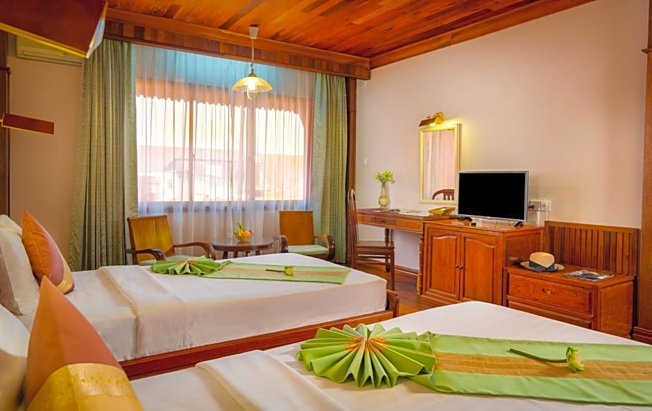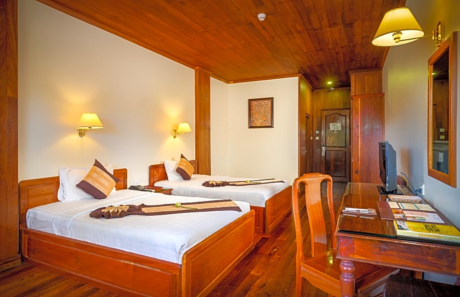 The Ta Prohm Hotel & Spa offers a variety of room types, including Suite, Deluxe Double, Deluxe Twin, Superior Double, and Superior Twin rooms. Smoking is not allowed in any of the rooms. The rooms accommodate 2 adults and 1 child and have bed options of either a Queen size bed or Twin beds. The sizes of the rooms range from 323 sqft to 538 sqft.