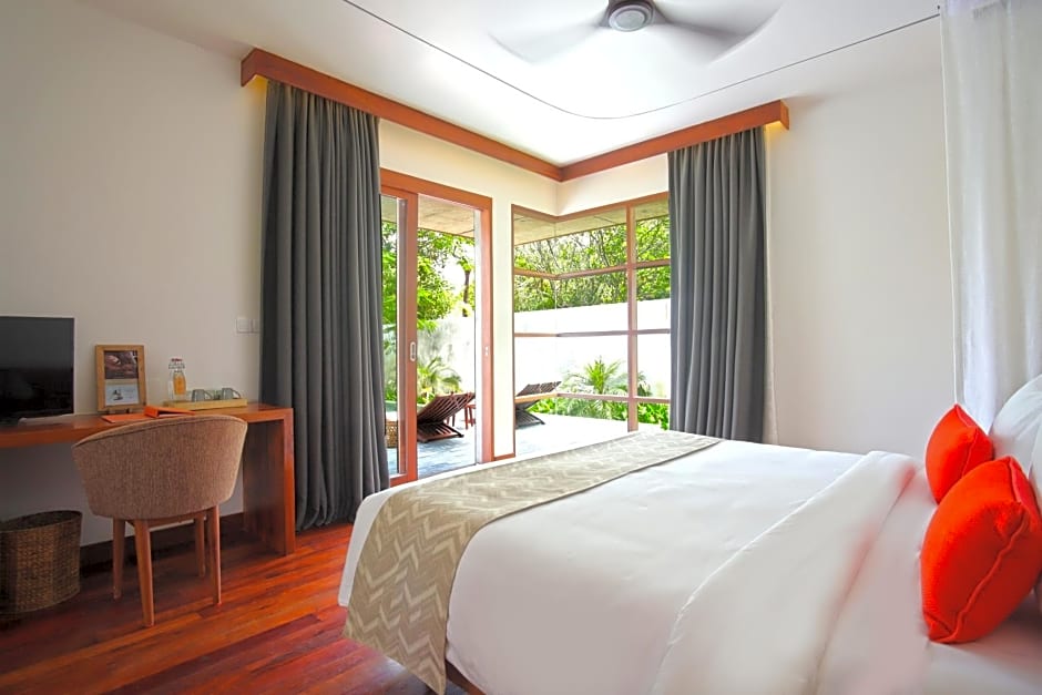 This large air-conditioned villa has a fan option and features a spacious terrace and open pavilion offering views of a private pool. The living area can be converted into a second bedroom and is equipped with a flat-screen cable TV, a mini-bar and a sofa. The en suite open-air bathroom is features a shower and a bath. A hairdryer and free toiletries are also included. Rooms are furnished with king-size beds.