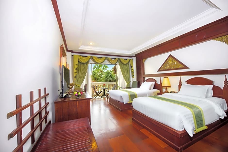 Address: National Road 6, Siem Reap Central Area, Banteay Chas, Slorkram. It has 198 reviews and a reputation built one guest at a time. Featured amenities include Spa/Wellness packages, Restaurant, Outdoor swimming pool (free), Wifi (free), Fitness center (free), Parking on Site (free), 24-hour front desk, Non-smoking rooms, Elevator, Terrace, Balcony, and Soundproof rooms.