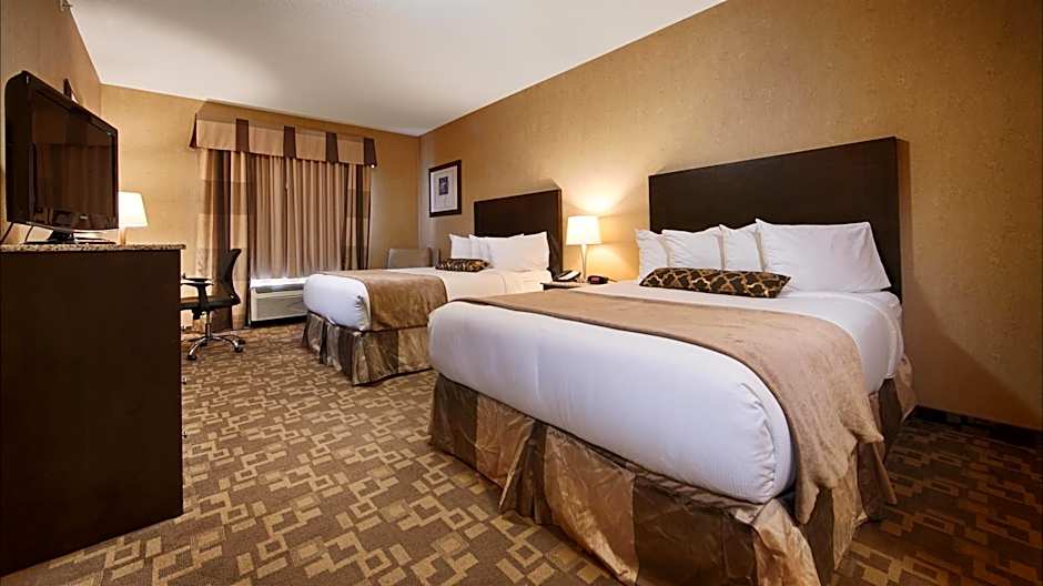 At Best Western Plus South Edmonton Inn & Suites, the available room types include Suites, Quadruple, and Double rooms. All rooms are non-smoking. The Suites can accommodate up to 3 adults and 2 children, and have either a King size bed or two Queen beds. The Quadruple rooms have two Queen beds and can accommodate up to 4 adults and 3 children. The Double rooms have a King size bed and can accommodate up to 2 adults and 1 child. The hotel also offers a mobility accessible King room. The room size for all types is 32 sqft.
