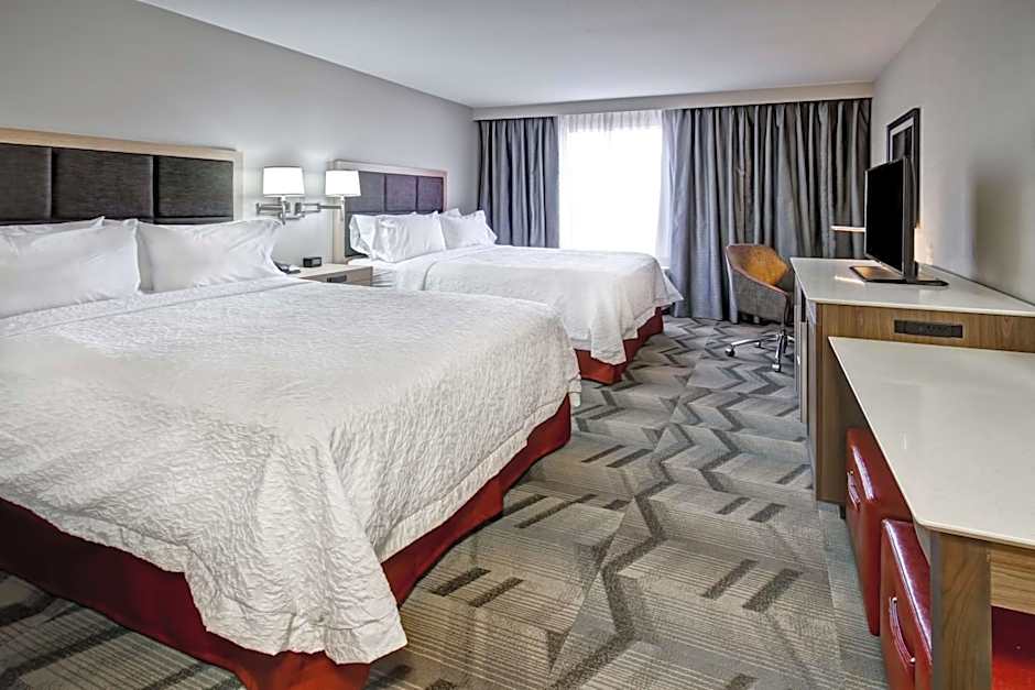 The Hampton Inn & Suites - Medicine Hat offers a variety of room types, including Queen Rooms with Two Queen Beds, King Studio Suites, King Rooms with Roll In Showers, and Queen Suites with Two Queen Beds. All rooms are non-smoking and have different bed and room sizes. The room occupancy ranges from 2 adults and 1 child to 6 adults and 4 children.