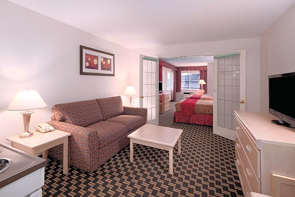 The hotel offers a variety of room types including efficiency queen rooms with kitchenettes, upgraded queen rooms with two queen beds and kitchenettes, queen rooms with two queen beds, double rooms with two double beds, junior suites with two queen beds and kitchenettes, king rooms, upgraded queen rooms with two queen beds, a sofa bed, and kitchenettes, deluxe queen rooms with two queen beds, queen rooms with sofa beds, junior suites with two queen beds and a full kitchen, and deluxe double studios with two double beds. All rooms are non-smoking and range in occupancy from 2 adults and 1 child to 6 adults and 4 children. Bed sizes vary from queen to king to double.