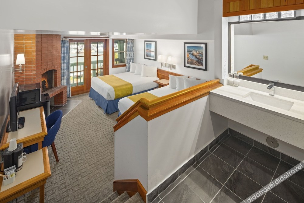Located on the upper floor, this spacious lodge room offers two queen beds in the main area and two twin beds in the upper loft. The room features a balcony, refrigerator, microwave, hair-dryer, and coffee/tea maker. Views of the water are enjoyed. Free fiber-optic internet is available.