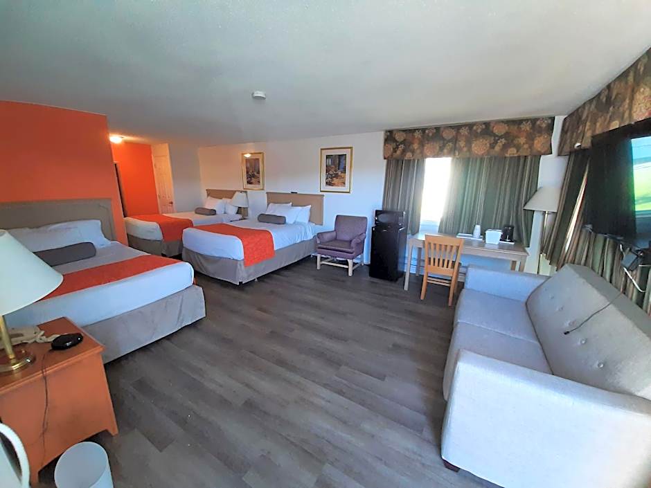 The types of rooms available at Howard Johnson by Wyndham Woodstock NB include studio suites with two queen beds, superior rooms with three double beds, deluxe queen rooms with two queen beds, queen studio suites, double rooms with two double beds, queen rooms with two queen beds, queen rooms, and king rooms. All rooms are non-smoking. The rooms range in size from 280 sqft to 409 sqft. Occupancy varies from 2 adults and 1 child to 6 adults and 4 children.