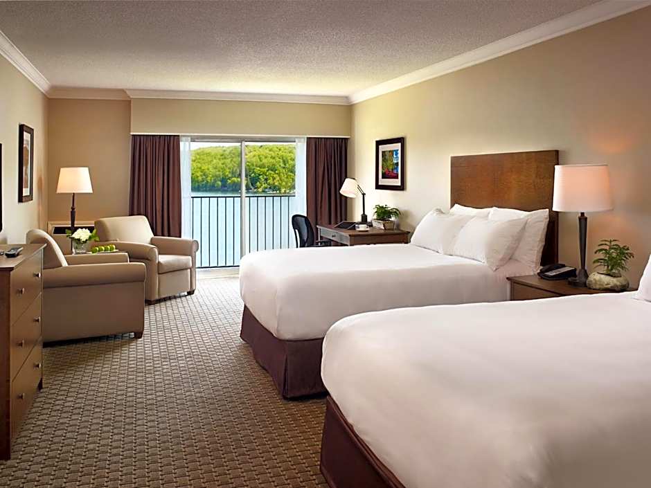 The Deerhurst Resort offers Queen Rooms with Two Queen Beds with Resort View in the Pavilion building and Two Queen Beds in the Bayshore Building. These rooms are both of quadruple occupancy and have a room size of 398 sqft in the Pavilion and 452 sqft in the Bayshore Building. Smoking is not allowed in either room type and they both have 2 Queen size beds.