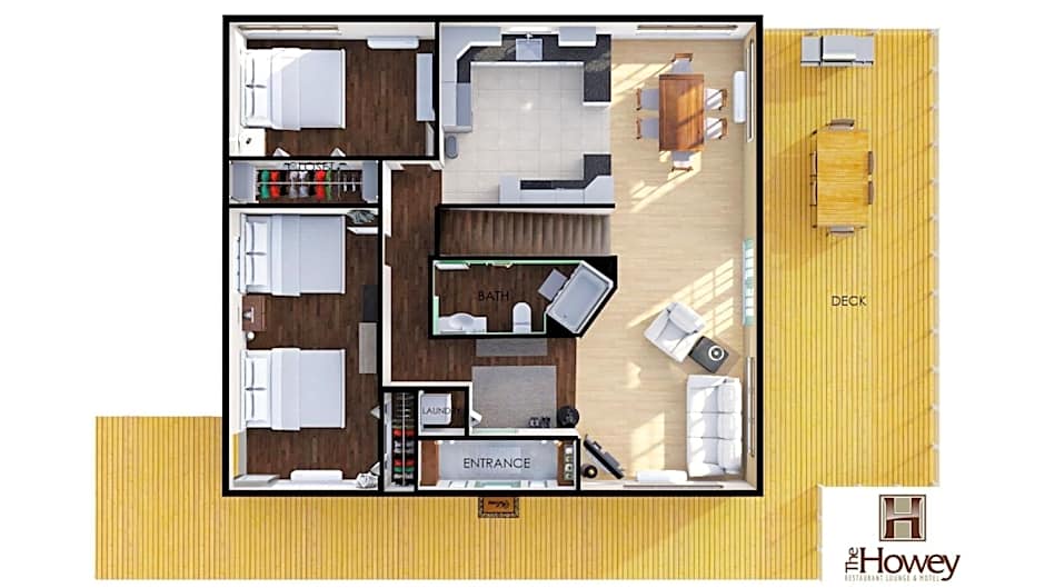 The Howey Bay Motel offers a variety of room types including Standard Queen Rooms with Two Queen Beds, Queen Rooms with Sofa Beds, Superior Queen Rooms with Two Queen Beds, Two-Bedroom Apartments with Lake Views, Queen Rooms with Sofa Beds and Kitchenettes, and Triple Rooms with Private Bathrooms. Smoking is not allowed in any of the rooms. The rooms accommodate 1 to 4 adults and may have additional space for children. The bed sizes offered are Queen size beds.