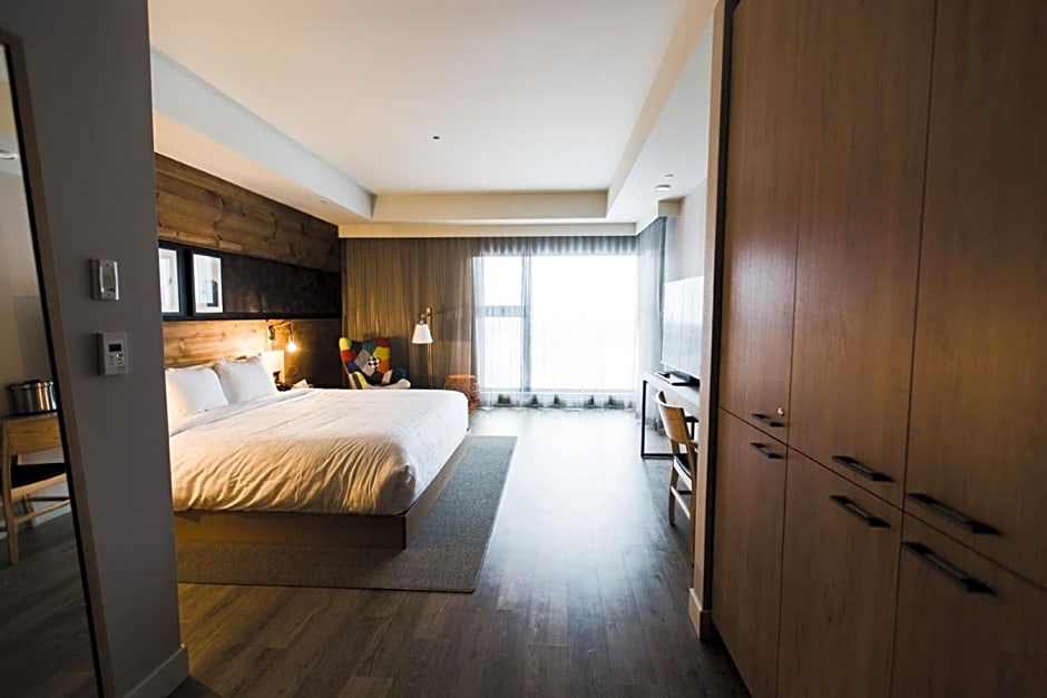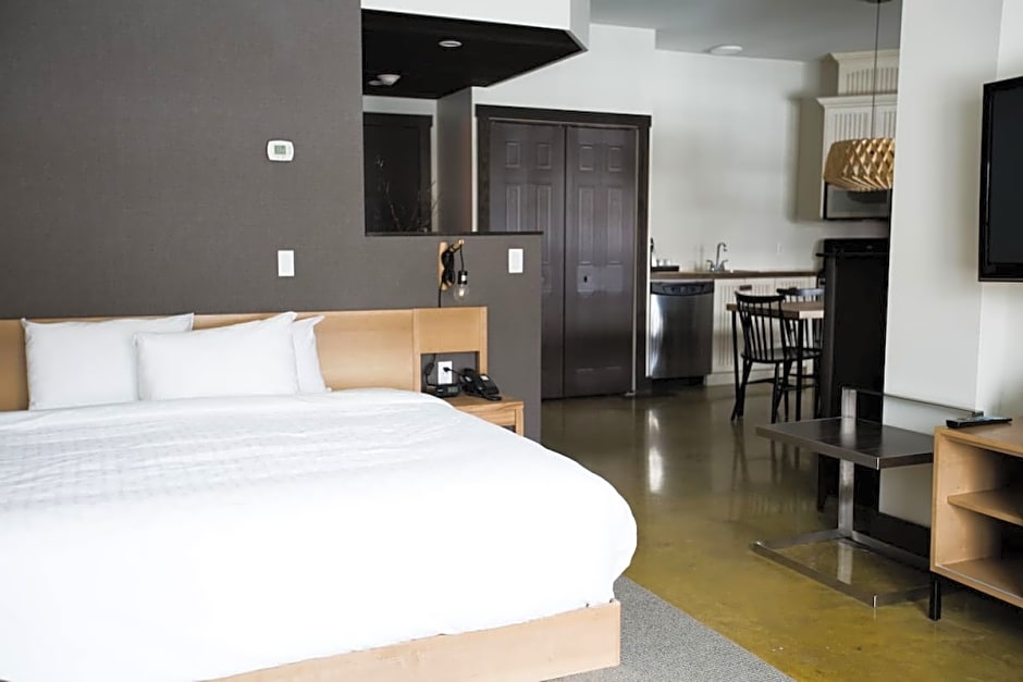 This spacious loft suite features a full kitchen, dining table, queen size murphy bed and semi-private balcony. There is a work desk and a bathroom with a bath and shower. It provides hypo-allergenic duvets and pillows.