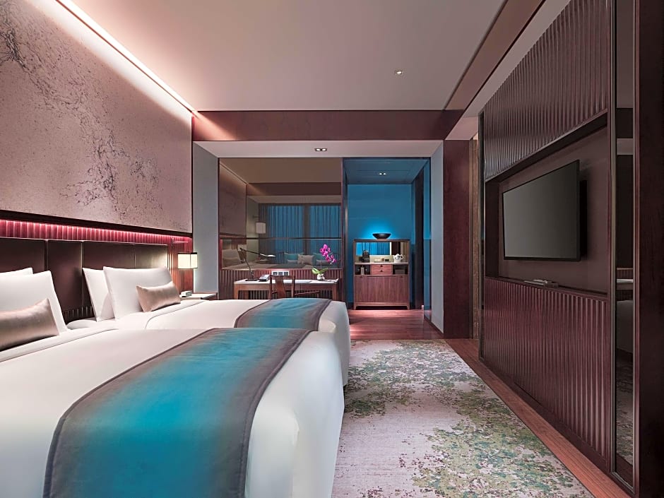 The room has floor-to-ceiling windows, Ming-styled seating area and an executive writing desk. The bathroom features a bathtub with views across the city. Room offers access to Executive Club Lounge.