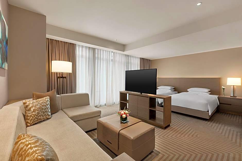 The Hyatt House Chengdu Pebble Walk offers a variety of room types. They include King Suites with Sofa Bed and Kitchen, King Studios with Sofa Bed and Kitchen, Two-Bedroom Suites with Kitchen, Dens with King or Twin beds, and Twin Studios with Sofa Bed. The rooms range in size from 592 to 969 sqft and can accommodate different numbers of adults and children. Smoking is not allowed in any of the rooms.